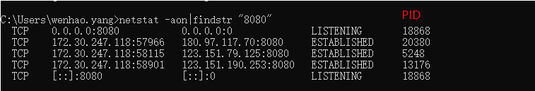 cmd命令行输入:netstat -aon|findstr "8080"