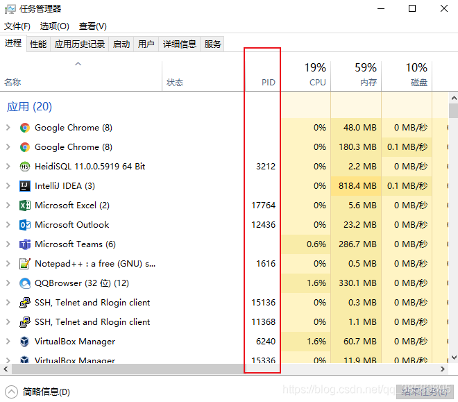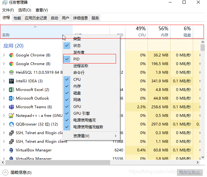 注:如果任务管理器中没有PID列,则在该区域中右键,选择显示PID列。