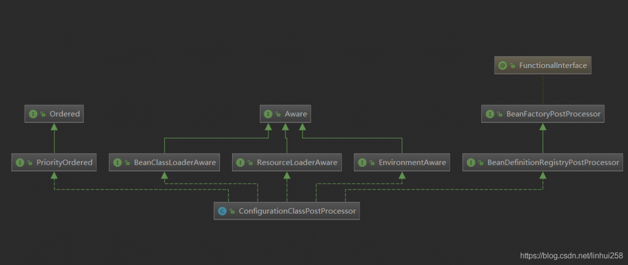 可以看到ConfigurationClassPostProcessor实现的接口总共有三个源头: