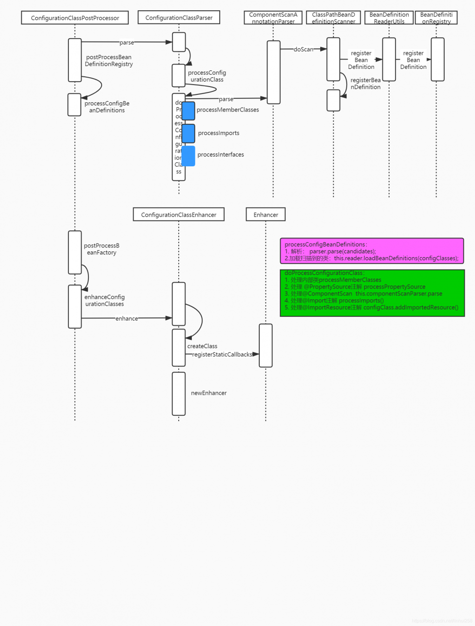 ConfigurationClassPostProcessor实现了BeanDefinitionRegistryPostProcessor接口,BeanDefinitionRegistryPostProcessor接口提供有两个方法,postProcessBeanDefinitionRegistry(BeanDefinitionRegistry)和postProcessBeanFactory(ConfigurableListableBeanFactory)。spring会先执行postProcessBeanDefinitionRegistry(),那么就先从postProcessBeanDefinitionRegistry()分析。
