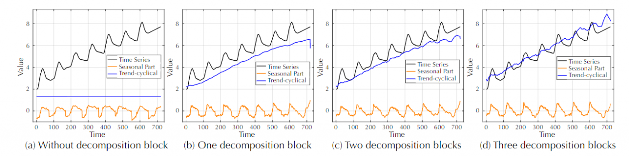 如图4所示,如果没有我们的序列分解块,预测模型将无法捕捉 seasonal 部分的增长趋势和峰值。通过增加序列分解块, Autoformer 可以逐步地聚合和细化序列中的 trend-cyclical 部分。这种设计还便于学习 seasonal 部分,特别是高峰和低谷部分。这验证了我们提出的渐进分解架构的必要性。