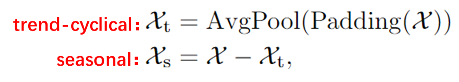 上面公式中所谓的 Padding 实现是代码中的 x = torch.cat([front, x, end], dim=1),front 是把原来输入的第一个复制多次(根据移动平均的长度),end 是把序列的最后一个进行复制多次(同front 次),然后把 它们cat 到一起,然后使用 AvgPool1d 后,结果的序列长度也就同X 一样,不会发生变化。