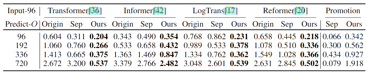 表2:利用MSE度量,在ETT数据集上进行分解的消融研究。 其中 Ours是本文提出的分解架构引入其他模型。 Seq采用两个模型分别来预测预处理分解的 seasonal 和 trend-cyclical 部分。 Promotion(提升) 是 和 Origin比, 预处理分解(Sep)和本文的分解架构(Ours)的 MSE 提升了多少。说明了 本文的方法提升的MSE 更多。