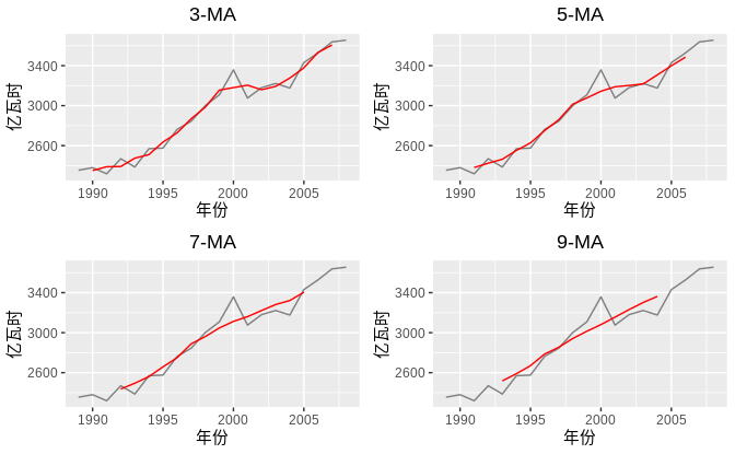 表中的最前面 2 年和最后面 2 年都没有值,因为我们在两端都没有观测值。之后我们会运用更复杂的方法来估计趋势-周期项,它可以求出端点的估计值。