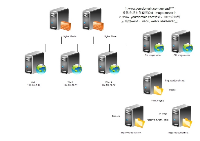 上面提到的几种架构,在上传/下载操作时,都经过了Web服务器(虽然共享存储的这种架构,也可以配置独立域名和站点来提供图片访问,但上传写入仍然得经过Web服务器上的应用程序来处理),这对Web服务器来讲无疑是造成巨大的压力。所以,更建议使用独立的图片服务器和独立的域名,来提供用户图片的上传和访问。