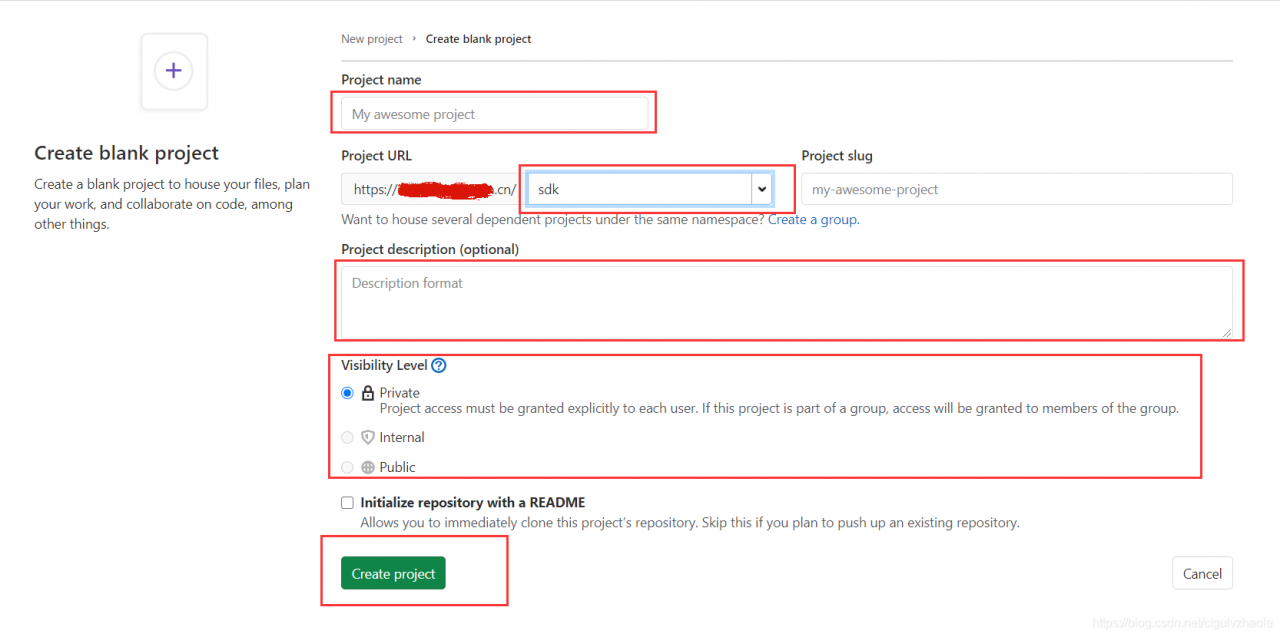 工程名字、工程URL、工程描述(描述工程的具体内容是什么)、可见等级(这里可以选择私有、内部、公开,这里可以根据自己实际来做选择,我这里选择私有,但是我依然可以指定相关成员来参与这个工程的维护)
