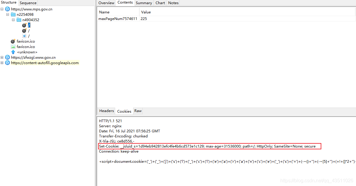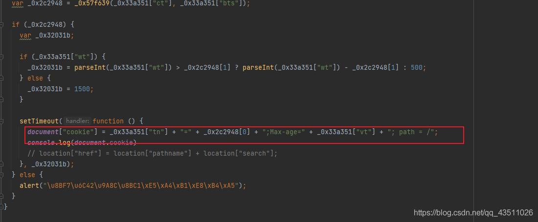 没有携带cookie发送请求返回的是一段代码 可以很明显的看到cookie的赋值,然后把代码复制出来掐头去尾拿出来运行一下看看