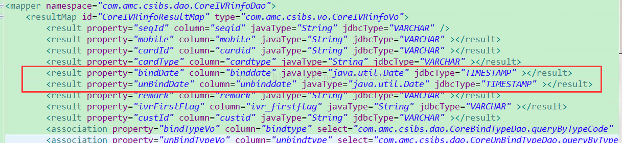 1.1当绑定时间的jdbcType=“DATE”,解绑时间的为jdbcType=“TIMESTAMP”,xml文件设置如下: