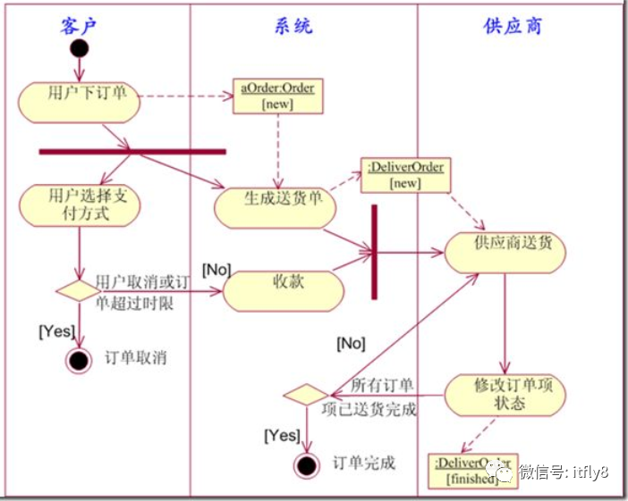 实心圆代表流程开始,空心圆代表流程结束,圆角矩形表示活动,菱形表示分支判断,此外,引入了一个重要的概念,泳道。可以根据活动的范围,将活动根据领域,系统角色的,划分到不同的泳道中,使流程边界更加清晰明了。