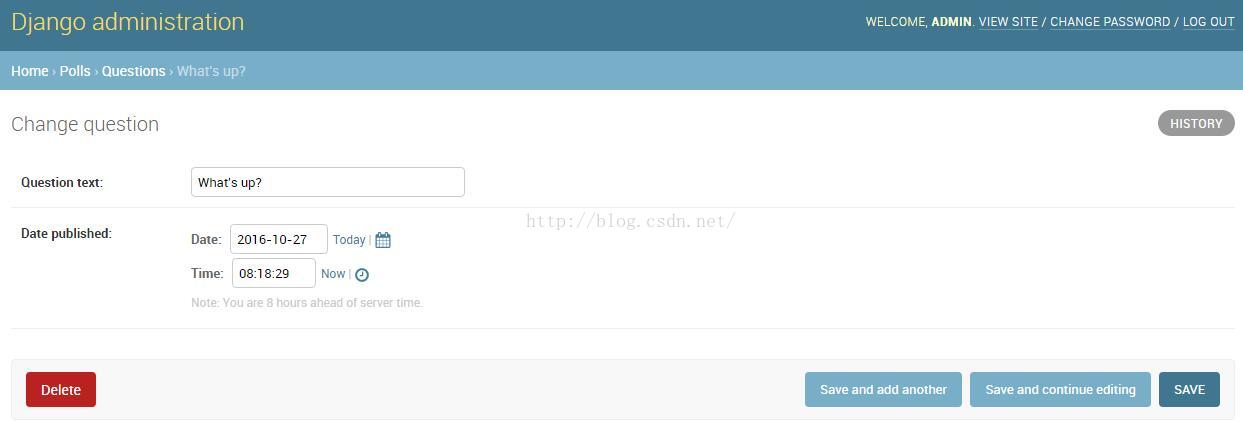 In [1]: import django In [2]: django.setup() In [3]: from polls.models import Question, Choice # No questions are in the system yet. >>> Question.objects.all() In [4]: from django.utils import timezone In [5]: q = Question(question_text="What's new?", pub_date=timezone.now()) In [6]: q.save() # Create a new Question. # Support for time zones is enabled in the default settings file, so # Django expects a datetime with tzinfo for pub_date. Use timezone.now() # instead of datetime.datetime.now() and it will do the right thing. # Save the object into the database. You have to call save() explicitly. # Access model field values via Python attributes. In [7]: q.id Out[7]: 1 In [8]: q.question_text Out[8]: "What's new?" In [9]: q.pub_date Out[9]: datetime.datetime(2016, 10, 27, 8, 18, 29, 785798, tzinfo=<UTC>) # Change values by changing the attributes, then calling save(). In [10]: q.question_text = "What's up?" In [11]: q.save() In [12]: Question.objects.all() Out[12]: <QuerySet [<Question: Question object>]> |
