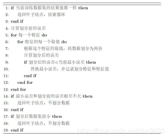注:训练数据结果相同、划分后最小误差和划分前误差相差不大、划分后数据集很小,这几种情况都直接返回叶子结点,不进行划分。