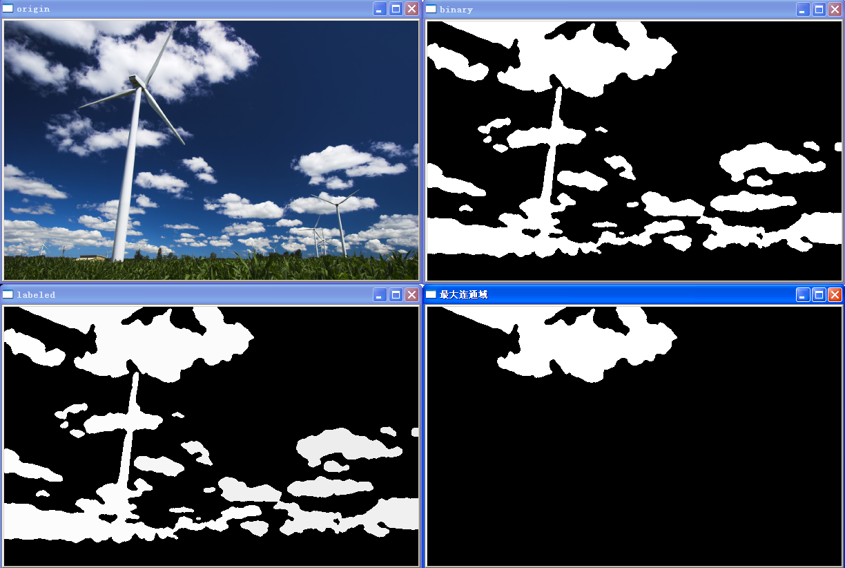 cvShowImage("最大连通域", green); // 显示最大连通域