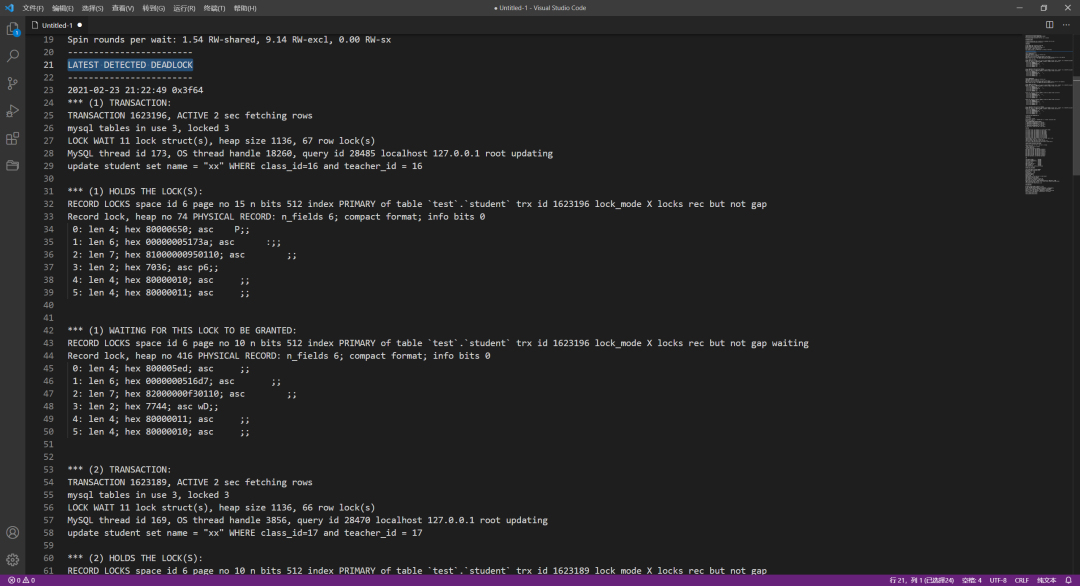 在日志中,我们找到 LATEST DETECTED DEADLOCK 这一行,这里开始便是我们上次产生的死锁,接下来我们开始分析。