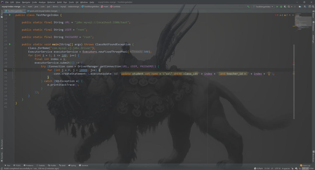 上述代码主要是开启 100 个线程执行我们的数据修改 SQL 语句,来模拟线上并发情况,在运行几秒钟后,我们会得到下面这样一个报错: