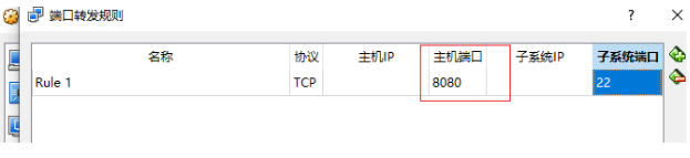 协议选择tcp,主机IP为空,表示localhost(127.0.0.1),子系统ip也为空,表示其默认IP10.0.2.15,主机端口可以自己设置,只要不和其他端口有冲突就行,子系统端口一般选择默认的ssh端口22,你还可以类比添加ftp等转发规则。