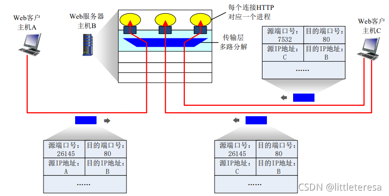 TCP的Socket用四元组标识,为(源IP地址,源端口号,目的IP地址,目的端口号)。接收端使用四个字段来将报文段导向合适的套接字。与UDP不同,两个不同的源IP地址或源端口号的TCP报文段会被定向给不同的套接字。服务器主机可以同时支持多个并行的TCP套接字,Web服务器也为不同的客户端开不同的套接字。