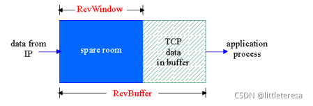 接收方为TCP连接分配buffer。假设TCP接收方丢弃乱序到达分组,buffer中可用空间用RcvWindow表示。接收方在报文段的头部字段将RcvWindow告诉发送方。发送方限制自己已经发 送的但还未收到ACK的数据不超过接收方的空闲 RcvWindow尺寸。若Receiver告知Sender RcvWindow=0,则发送方也会发送很小的数据段。