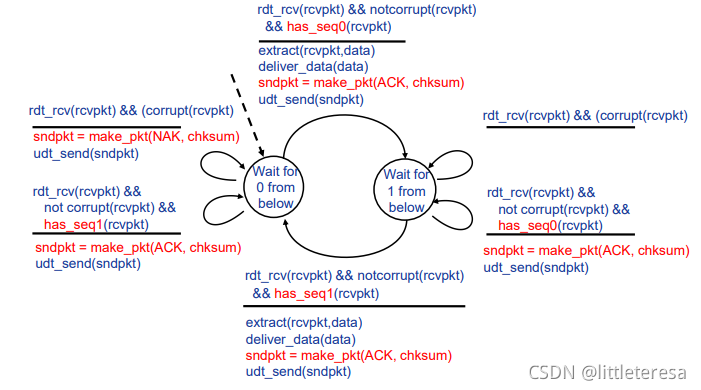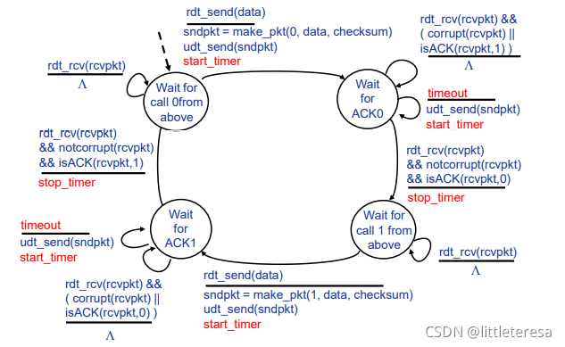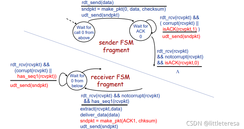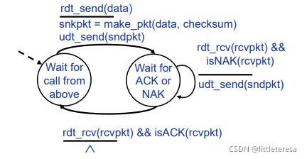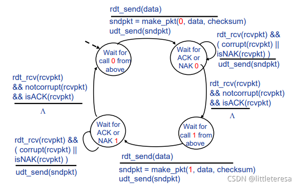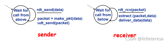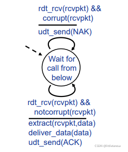 我们仅考虑单向的数据传输,但是RDT的发送和接受方都要调用udt_send()发送分组,控制信息是双向的。使用FSM刻画传输层协议。