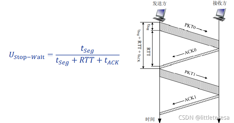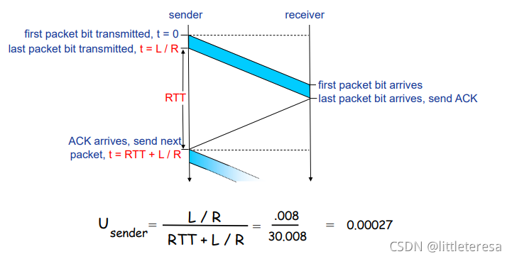停等操作能正确实现,但性能很差。发送方利用率为发送方发送时间百分比,计算如下(假设ACK很小):