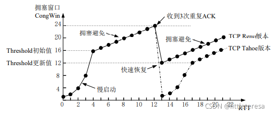 当收到3个重复ACK时,进入快速恢复阶段,将Threshold更新为当前CongWin的一半,CongWin只下降一半,到Threshold