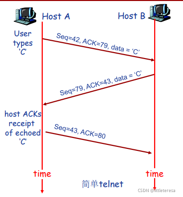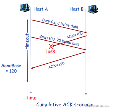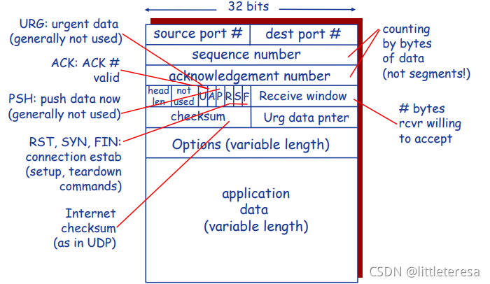 序列号指的是segment中第一个字节的编号, 而不是segment的“连续”编号。建立TCP连接时,双方随机选择序列号 。ACKs为希望接收到的下一个字节的序列号。采用累计确认的方式,该序列号之前的所有字节均已被正确接收到。