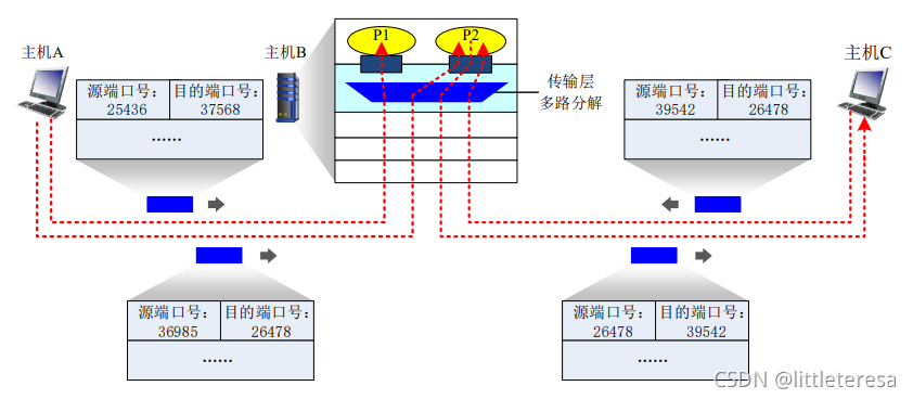 多路复用:源主机从不同套接字收集数据块并为每个数据块封装首部信息生成报文段,然后将报文段传递到网络层。