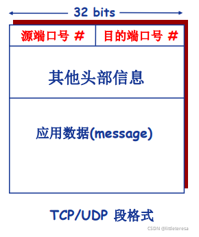多路分用:接收端传输层检查这些字段,将报文段定位到对应的套接字。(数据交付到正确的套接字)