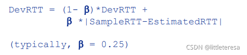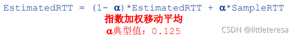 估计RTT:首先计算SampleRTT,忽略段的重传,测量从段发出去到收到ACK的时间。 SampleRTT会有变化,在变化时采用测量多个SampleRTT,求平均值, 形成RTT的估计值EstimatedRTT的方式。