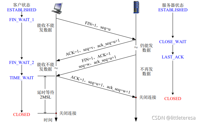 Step 3: client 收到FIN, 回复ACK. ▪ 进入“等待” ,如果收到FIN,会重新发送ACK