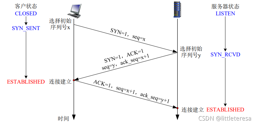 1. 客户端向服务器发送一个特殊的TCP报文段,其中SYN段被置为1,同时随机选择一个初始序号,不包含任何应用层数据。