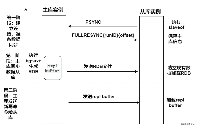 psync命令进行数据同步(psync命令包含:主库的runID和复制进度offset两个参数),当主库接收到psync 命令后将会保存RDB 文件并发送给从库,发送期间会使用缓存区(