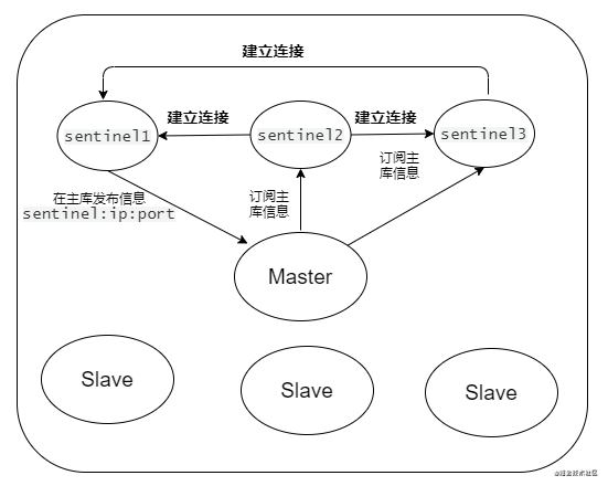 哨兵 2 和 3 就可以从这个频道直接获取哨兵 1连接信息,以这样的方式哨兵集群就形成了,实现各个哨兵互相通信。