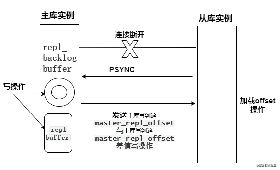 主从库间网络断了, 主从库会采用增量复制的方式继续同步,主库会把断连期间收到的写操作命令,写入 replication buffer,同时也会把这些操作命令也写入 repl_backlog_buffer 这个缓冲区,然后主库并通过master_repl_offset 和 slave_repl_offset的差值数据同步到从库。
