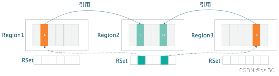 如果没有RSet,如何判断C、D是否存活呢?先扫描Region2所有对象,然后再到Region1和Region3判断是否被引用了,最终判断C、D被引用存活。
