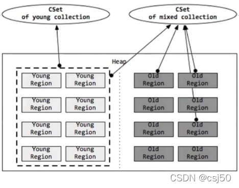 2、上图中,在YoungGC的时候,young CSet存的是Young Region。在MixedGC的时候,mixed CSet存了所有的Young region和部分的Old region。