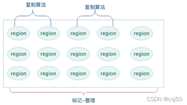 局部:把整个堆,切割为大小均匀的多个region,region与region之间采用标记-复制算法实现