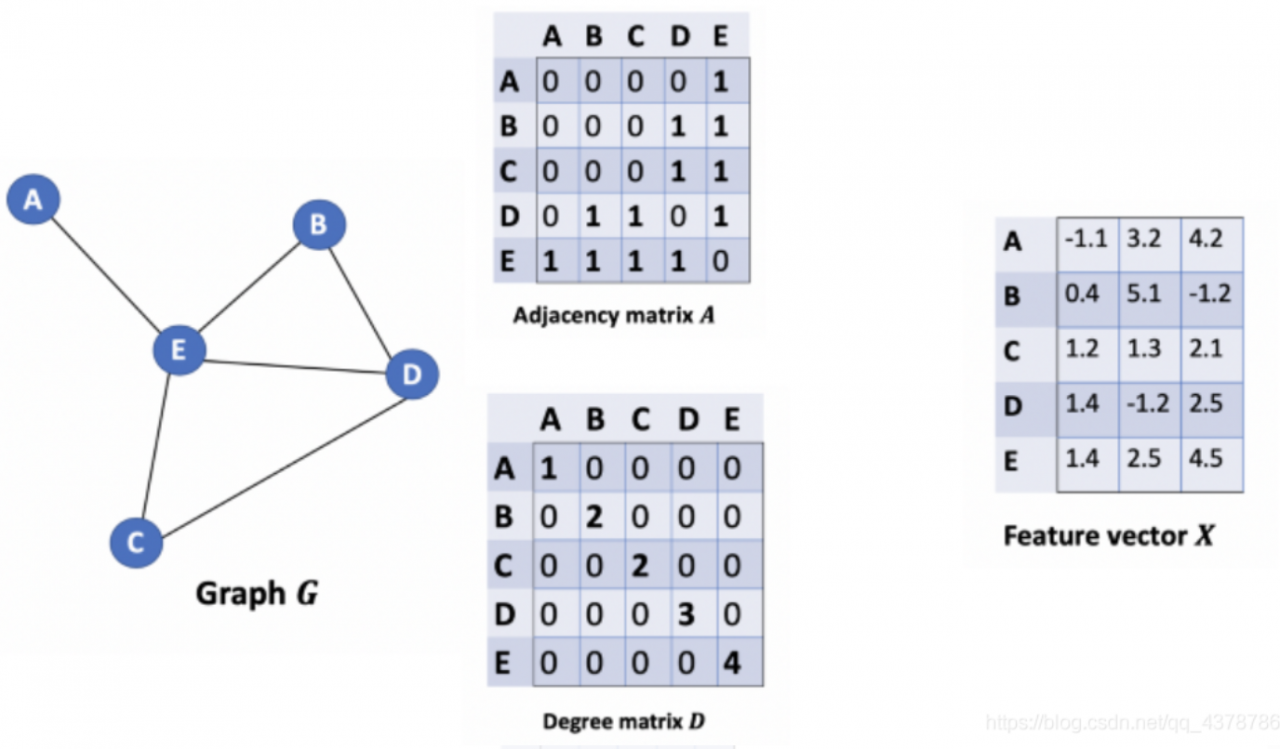 在这里V VV表示图中节点的集合,而E EE为边的集合。对于图特征,我们一般有三个重要矩阵进行表示。