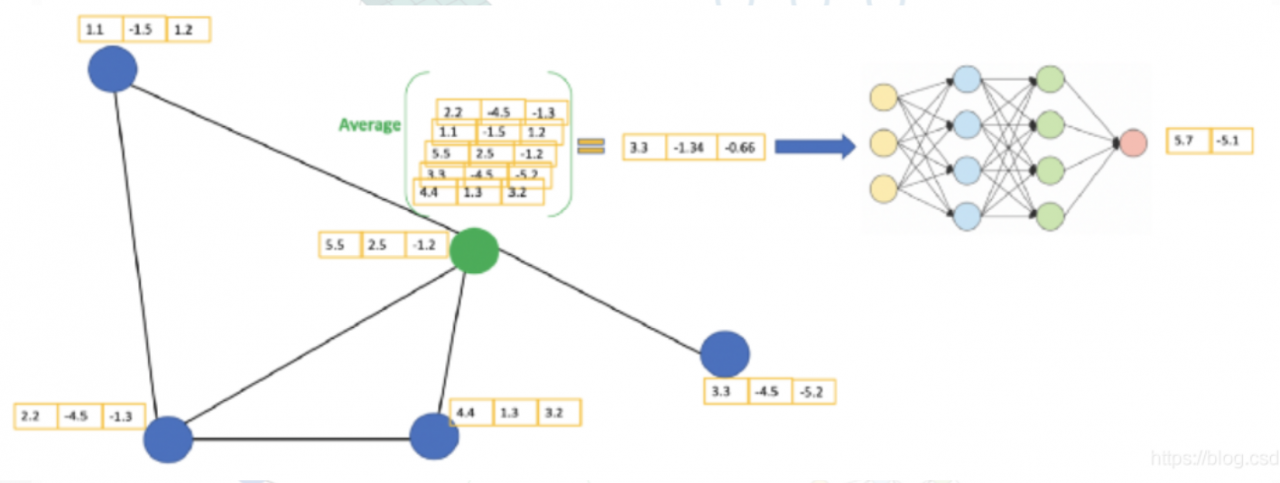 GCN通过考虑节点本身以及邻居节点的特征信息来提取潜在的关系。比如我们在中心节点拼接了邻居的特征后,使用平均池化的方式对这些特征进行聚合,再通过浅层网络进行学习训练得到新的数据。