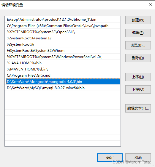 path: "D:\\SoftWare\\Mongodb\\mongodb-4.0.5\\log\\mongodb.log"6. 在 bin 目录下启动 CMD 命令行, 然后执行 (第一次需要配置这个)