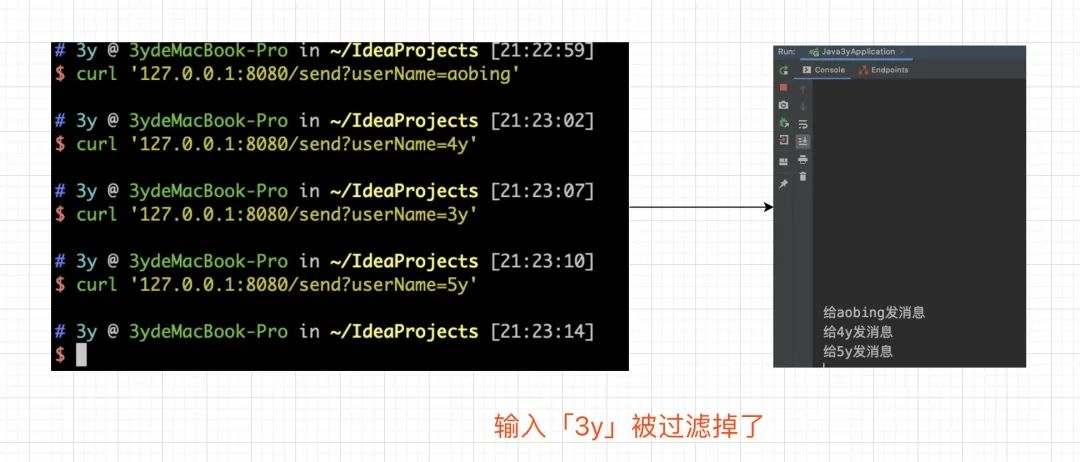 下面我们还是来看看效果,从功能上我们可以发现,只要我们输入的不是「3y」,那就会打印消息