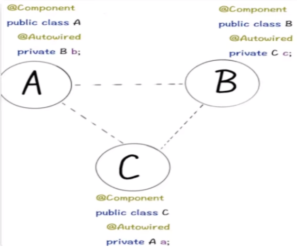 多个bean之间相互依赖,形成了一个闭环。比如:A 依赖于B,B依赖于C,C依赖于A