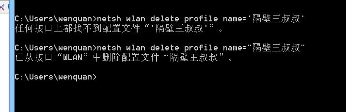 输入netsh wlan delete profile name="隔壁王叔叔"(注意是英文的双引号)