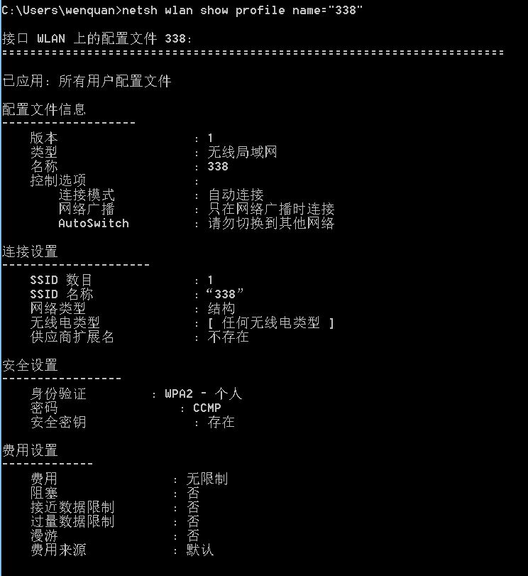在命令行出入:netsh wlan show profiles来查看系统中已经存在的我无线网络配置文件