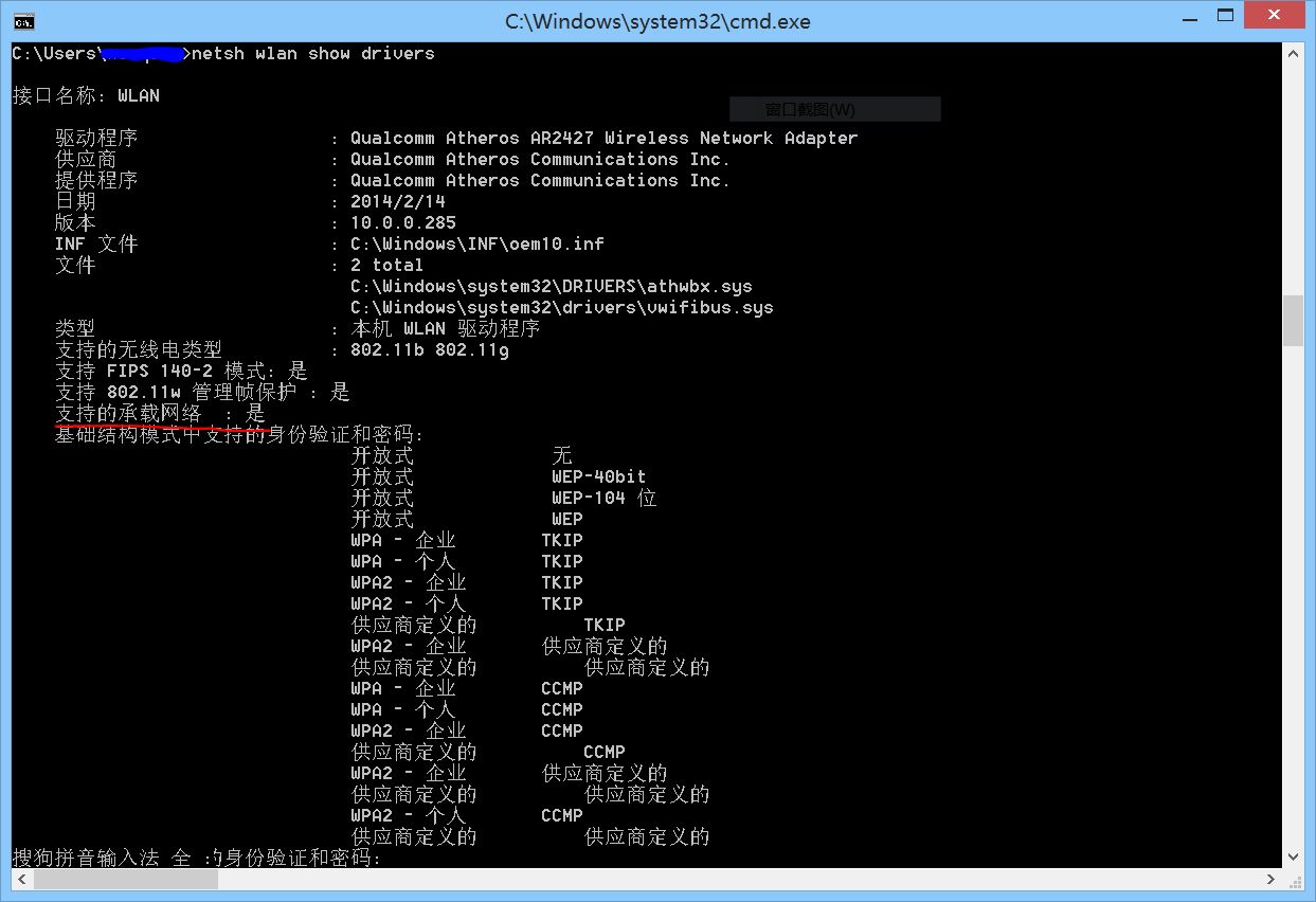进入cmd后输入 netsh wlan show drivers