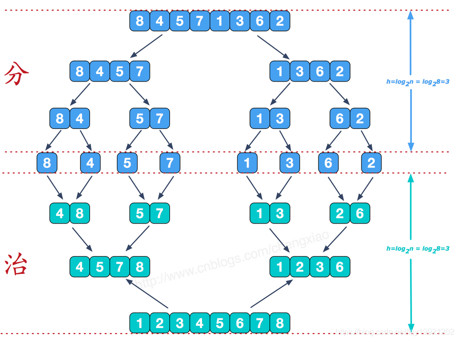 - 归并排序(MERGE-SORT)是利用归并的思想实现的排序方法,该算法采用经典的分治(divide-and-conquer)策略(分治法将问题分(divide)成一些小的问题然后递归求解,而治(conquer)的阶段则将分的阶段得到的各答案"修补"在一起,即分而治之)。