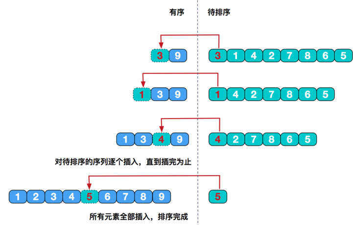 - 然后,将未排好序序列中的元素逐一插入到已排好序的序列中