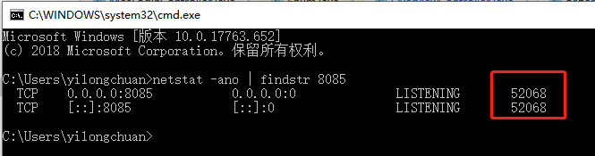 第二步:在dos窗口中输入指令:netstat -ano | findstr 8080,其中8080是指你被占用的端口号,然后会显示出现在占用该端口号的pid。