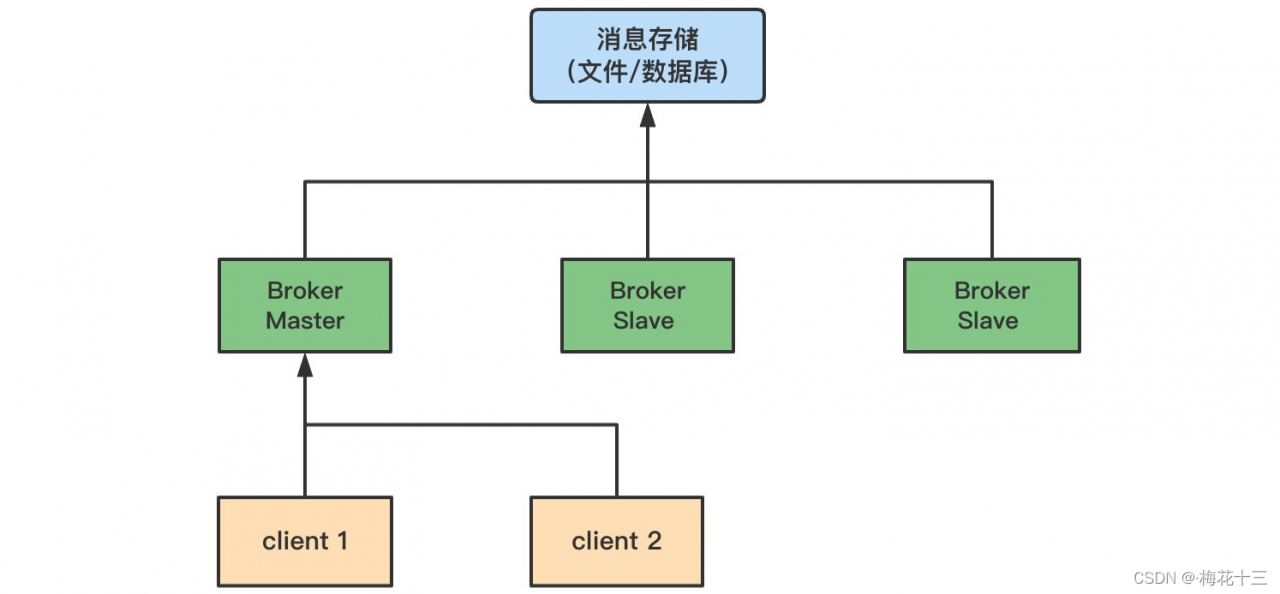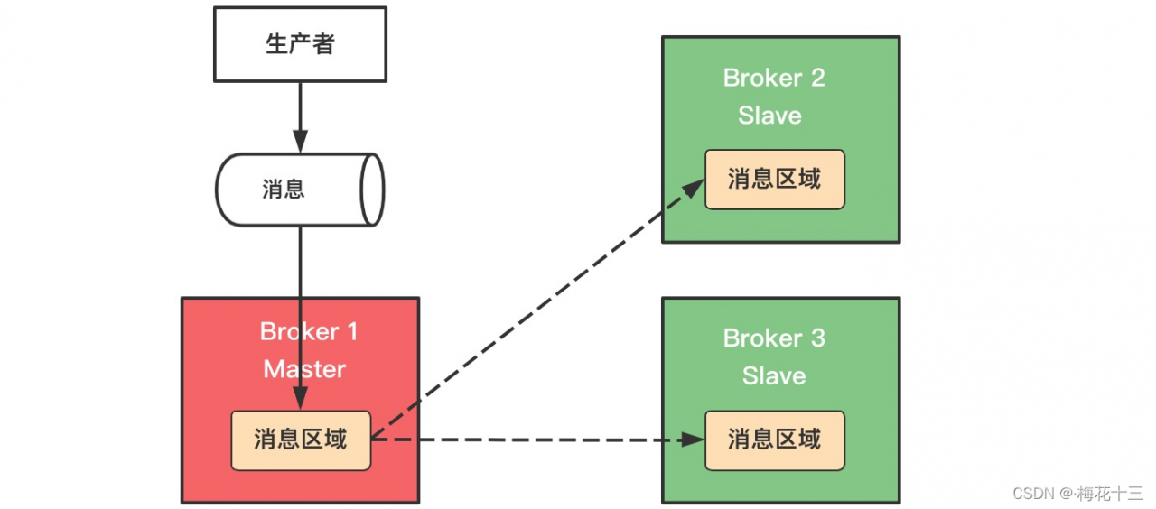 ✦ 解说:所有的主从节点Broker 都链接到数据共享区域,Master节点负责写入,一旦Master挂掉,slave节点继续服务,从而形成高可用。