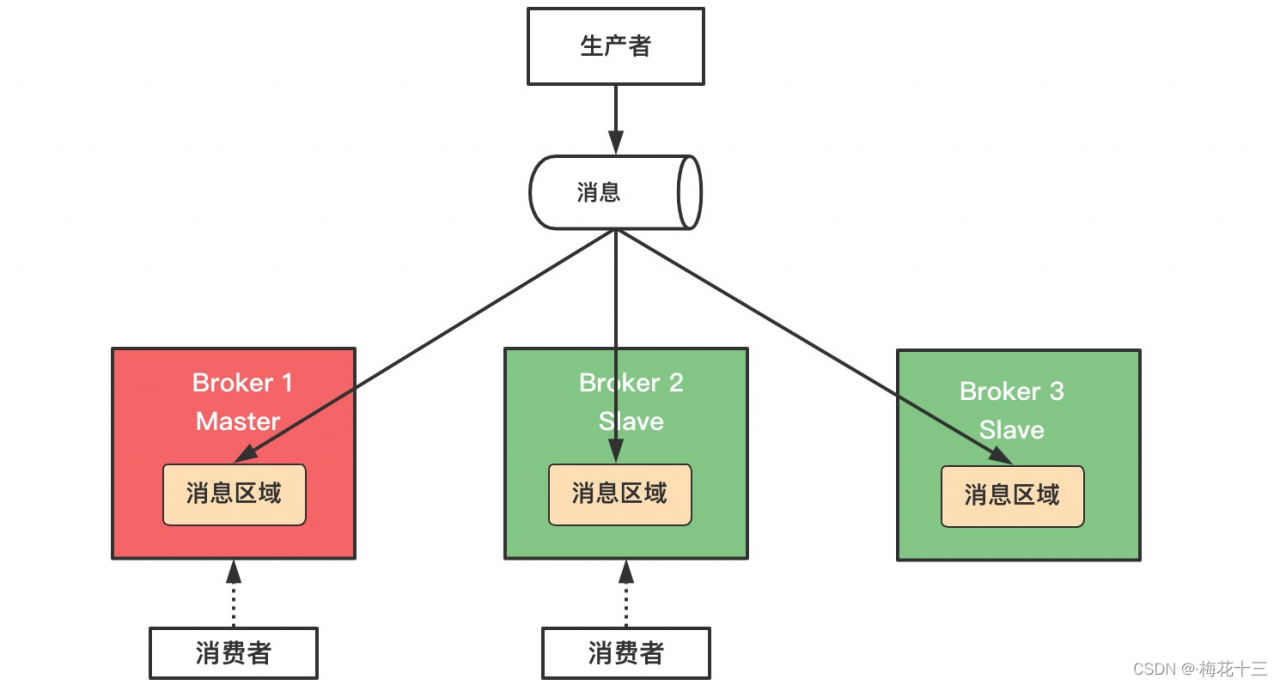 ✦ 解说:和zookeeper或者redis主从机制很类同,这样可以达到负载均衡的效果,如果消费者有多个,则可以去不同的节点进行消费。