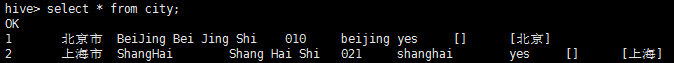 create external table city(city_id string,city_name string,pinyin string,pingying2 string,code string,db_name string,city_status string,default_areas string,yum_city_name string) row format delimited fields terminated by '\u0000' location 'hdfs://hadoop01:8090/test/city';